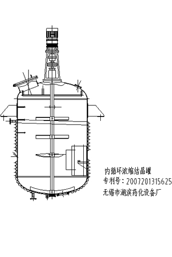 在设备内筒体的某一高度加一定数量的列管式加热装置。 独特的底轴承结构(安装在底封头外側)可在不拆卸主轴及减速机等情况下随意更换底轴承和密封件。 列管式加热利用物料加热后在列管内往上冲这一特性,来帮助物料顺着搅拌所需要而达不到的地方翻滚流动,既增大了加热面积,又因列管式加热器的造浪涌动,加大了物料的蒸发表面积,从而缩短蒸发浓缩及结晶的时间,提高了生产效率。